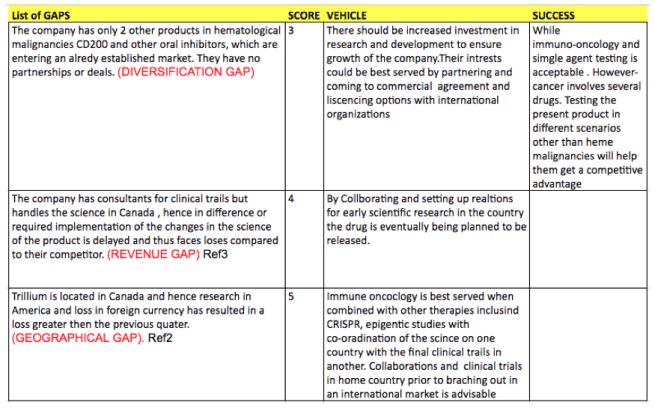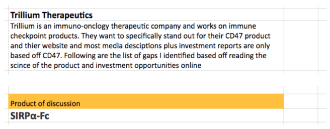 Task 1: Identify the gapChoose one candidate and identify a gap. You might explore ways to expand the candidate in different indications, populations, or markets. For Celldex Therapeutics, one gap might be the indications the antibodies they are making could be targeted against. For example, Celldex has a license agreement with Southampton to develop human antibodies towards CD27, “a potentially significant target for immunotherapy of various cancers.” If you are unfamiliar with business terms, watch this brief video explanation of how to identify gaps. |