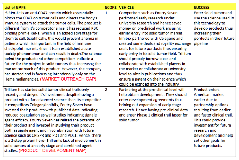 Task 1: Identify the gapChoose one candidate and identify a gap. You might explore ways to expand the candidate in different indications, populations, or markets. For Celldex Therapeutics, one gap might be the indications the antibodies they are making could be targeted against. For example, Celldex has a license agreement with Southampton to develop human antibodies towards CD27, “a potentially significant target for immunotherapy of various cancers.” If you are unfamiliar with business terms, watch this brief video explanation of how to identify gaps. |